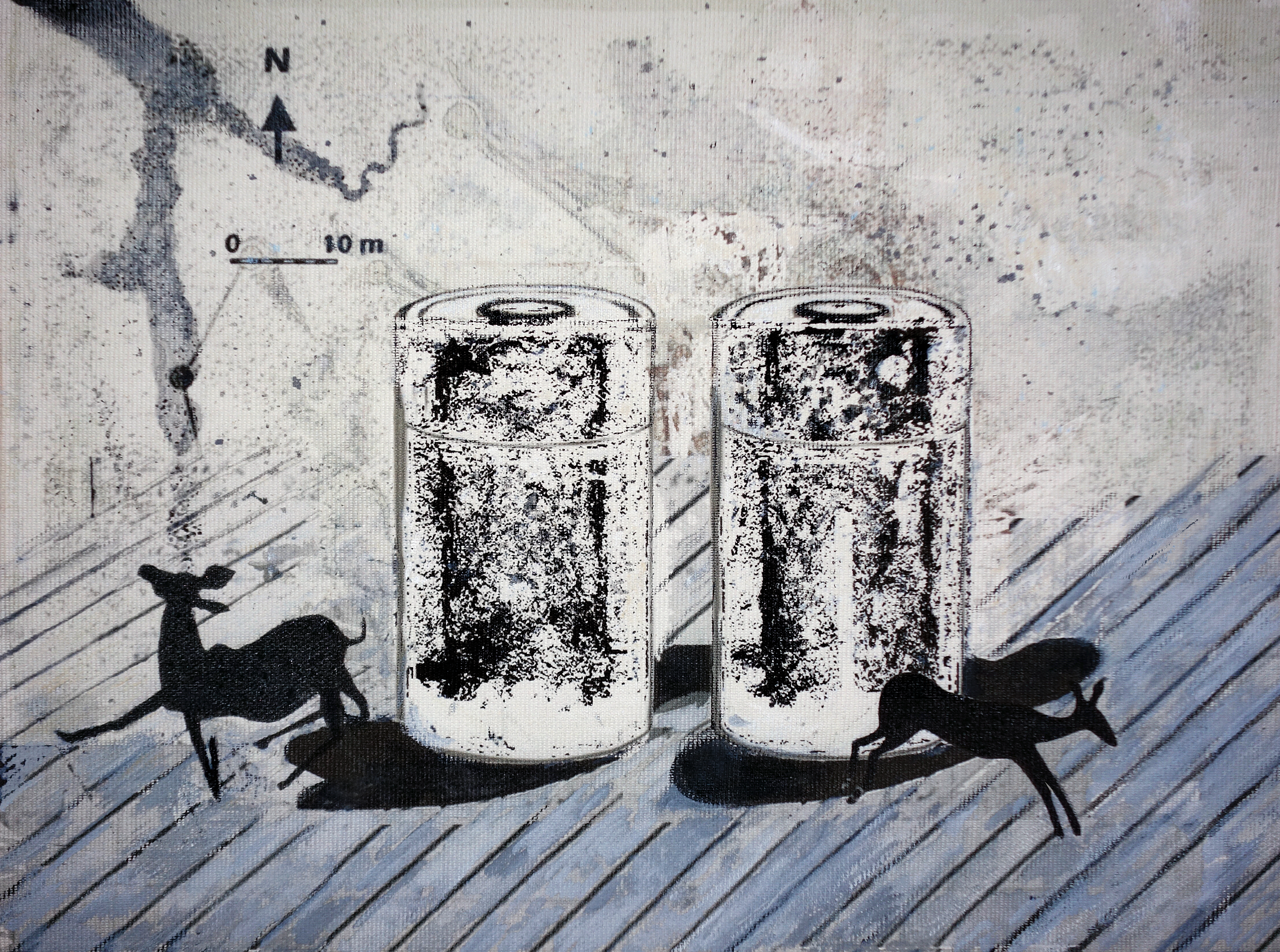 Ink, pastel, gouache, reclaimed manganese black pigment from battery on canvas